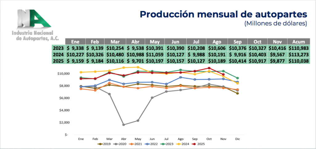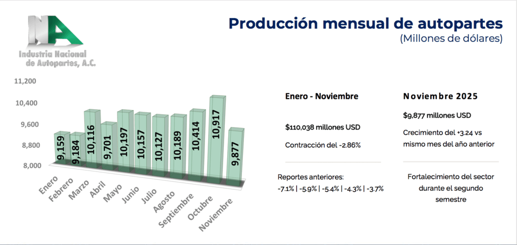 Ciudad de México.— En la conferencia de prensa mensual, Julio Galván, gerente de Estudios Económicos de la Industria Nacional de Autopartes (INA), detalló que de enero a noviembre de 2025 la producción nacional de autopartes alcanzó un valor de 130,036 millones de dólares, lo que representa una contracción de 2.36% en comparación con el mismo periodo del año anterior. No obstante, el dato de noviembre refleja una recuperación relevante: durante ese mes la producción fue de 9,877 millones de dólares, con un crecimiento de 3.24% anual, desempeño que confirma una mejora gradual del sector en el cierre del año.