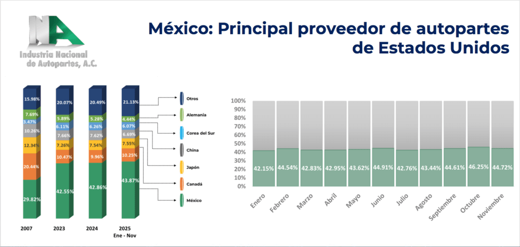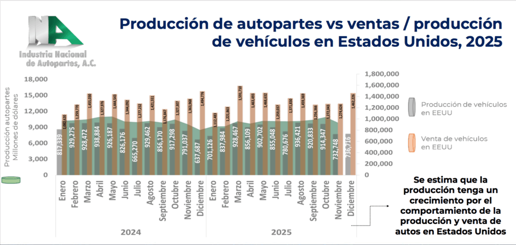 Galván explicó que el comportamiento del mercado mexicano de autopartes está estrechamente vinculado a lo que ocurre en Estados Unidos, principal destino de las exportaciones del sector. En ese sentido, el análisis se complementa con el desempeño de la producción y venta de vehículos en el mercado estadounidense. Durante noviembre de 2025, en Estados Unidos se produjeron 732,748 vehículos, mientras que las ventas acumuladas alcanzaron 1,274,624 unidades. Para diciembre, la producción fue de 736,716 vehículos, con ventas por 1,462,226 unidades, lo que permite anticipar una tendencia positiva para la demanda de autopartes en los próximos meses.