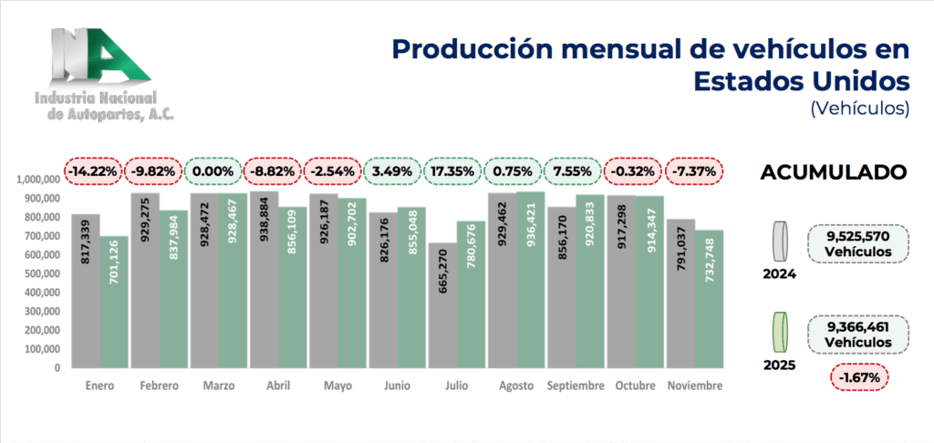 En cifras acumuladas, la producción de vehículos en Estados Unidos durante 2025 registró una caída de 1.67% respecto a 2024, con un volumen total de 9,366,461 unidades, dato que ayuda a explicar la moderación observada en algunos indicadores del sector autopartes en México durante el año.