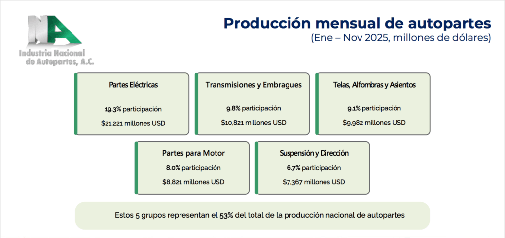 Respecto a la estructura productiva del sector, las partes eléctricas encabezaron la producción nacional con una participación de 19.3%, equivalente a 21,221 millones de dólares. Le siguieron las transmisiones y subconjuntos, con 9.8% y 10,821 millones de dólares; telas, alfombras y asientos, con 9.1% y 9,982 millones; partes para motor, con 8% y 8,821 millones; y suspensión y dirección, con 6.7% y 7,367 millones de dólares. En conjunto, estos cinco grupos concentraron 53% de la producción nacional de autopartes.