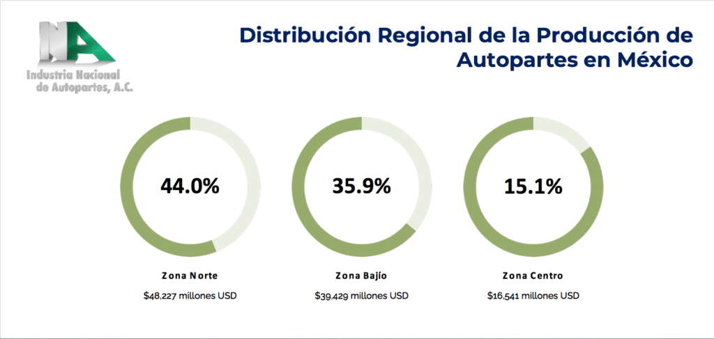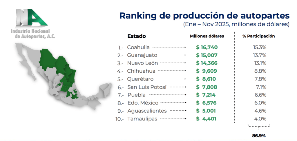 Por entidad federativa, Coahuila lideró la producción nacional con 16,740 millones de dólares y una participación de 15.3%, seguido de Guanajuato, con 15,000 millones y 13.7%; Nuevo León, con 14,366 millones y 13.1%; Chihuahua, con 9,609 millones y 8.8%; y Querétaro, con 8,610 millones de dólares y 7.8% de participación. Junto con San Luis Potosí, Puebla, Estado de México, Aguascalientes y Tamaulipas, estos diez estados concentraron 86.9% de la producción nacional.
