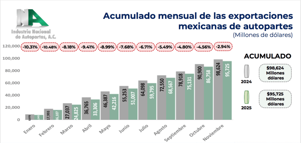 En materia de comercio exterior, las importaciones estadounidenses de autopartes provenientes de México mostraron una disminución en noviembre de 3.44%, al ubicarse en 6,403 millones de dólares, frente a los 6,631 millones registrados en el mismo mes de 2024. En el acumulado de enero a noviembre, estas exportaciones sumaron 75,851 millones de dólares, lo que representa una caída anual de 1.85%.
